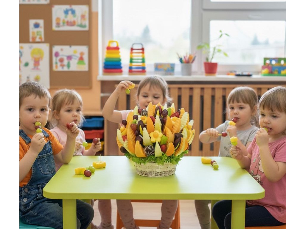 Vyřezávané Kousky: Ananasové květy a melounové tvary dodávají koši hravost a umělecký šmrnc.