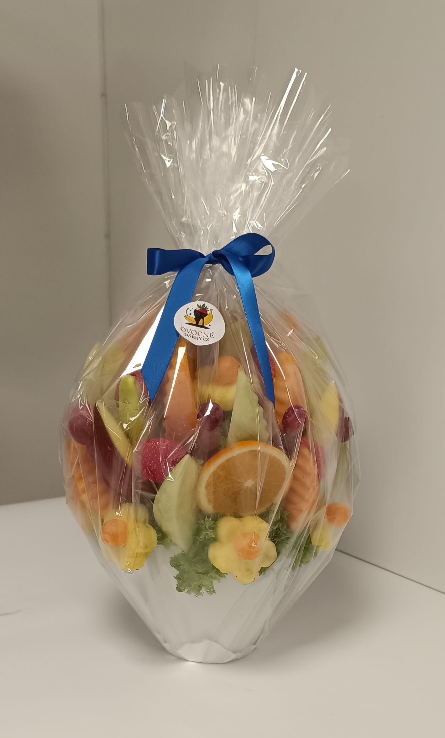 Na balení si dáváme záležet stejně jako na výrobě. Každou ovocnou kytici pečlivě balíme do potravinářské ochranné fólie, aby k vám dorazila v perfektním stavu. Ovocné bonboniéry ukládáme do elegantních dárkových krabiček určených přímo pro potraviny. Celkový dojem na závěr podtrhne stylová mašle, kterou barevně sladíme s konkrétní variantou vašeho Ovocného dárku