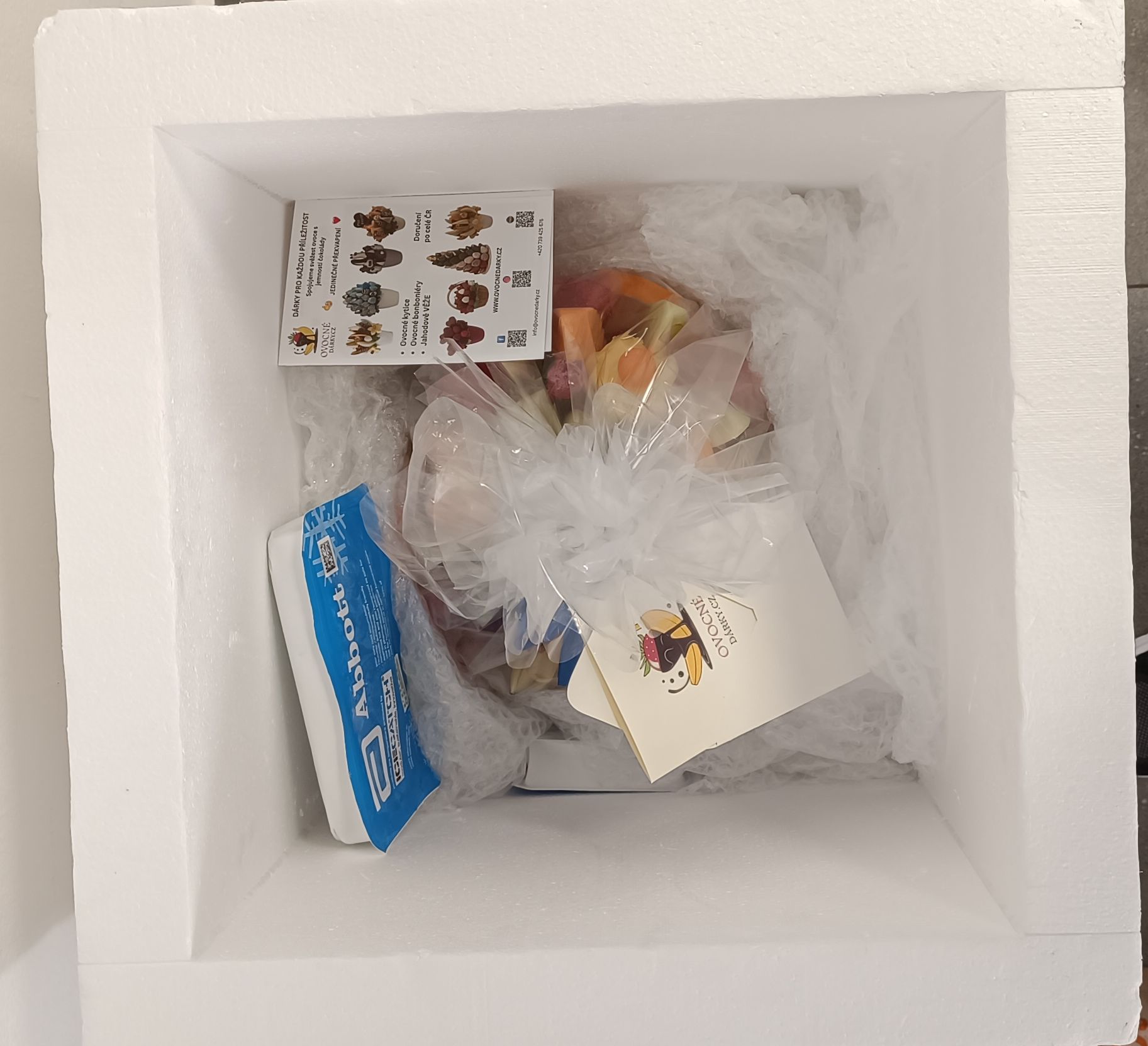 Každý Ovocný Dárek následně pečlivě balíme do bublinkové fólie a fixujeme ve speciálním termoboxu o síle stěn 5cm. To zaručuje nejen bezpečí při přepravě, ale především dokonalou tepelnou izolaci. Mimo Prahu využíváme pro noční přejezdy výhradně chlazenou logistiku – od depa až po dodávku. Garantujeme tak nepřetržitou teplotu do 5 °C. Váš Ovocný dárek proto přijede v té nejlepší kondici: 100% čerstvý, vychlazený a připravený k nakousnutí.