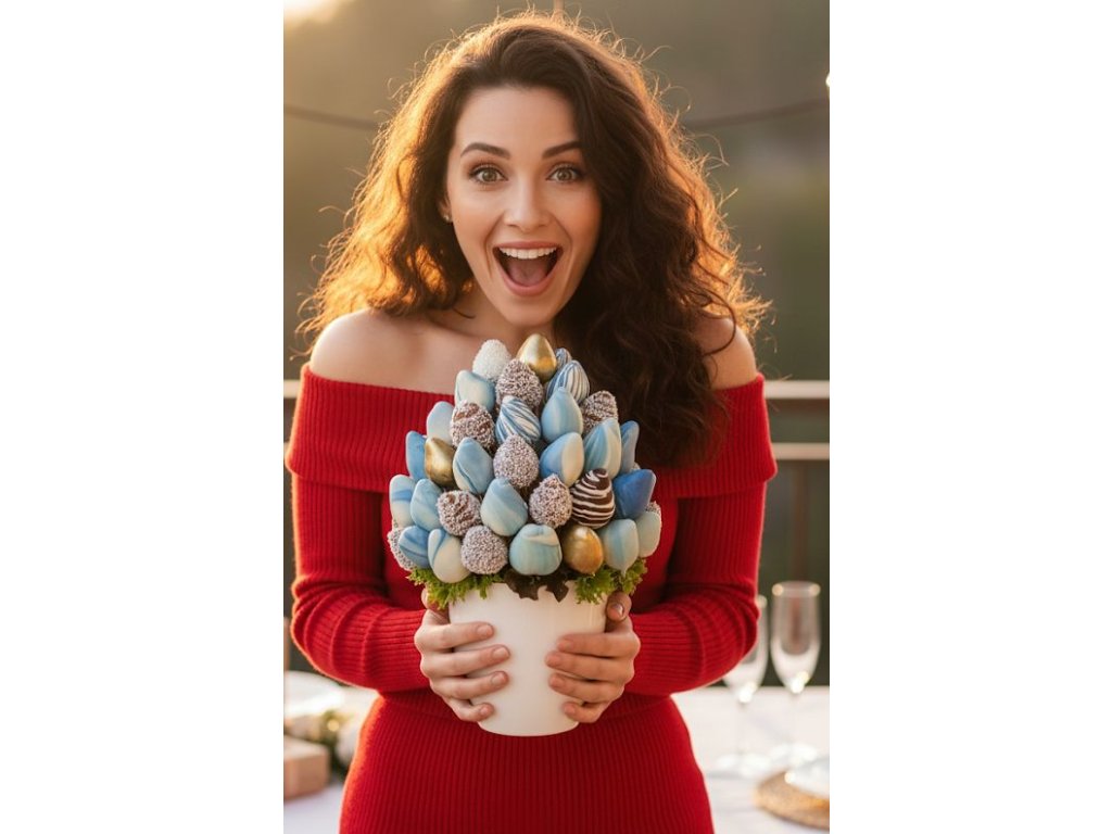 Darujte "Modré z nebe" – jedlou kytici. Čerstvé jahody ve spojení s jemnou čokoládou v modrých odstínech jsou nejen lahodné, ale i vizuálně fascinující. Tato luxusní kytice je ručně připravována s péčí, aby každý detail byl dokonalý.