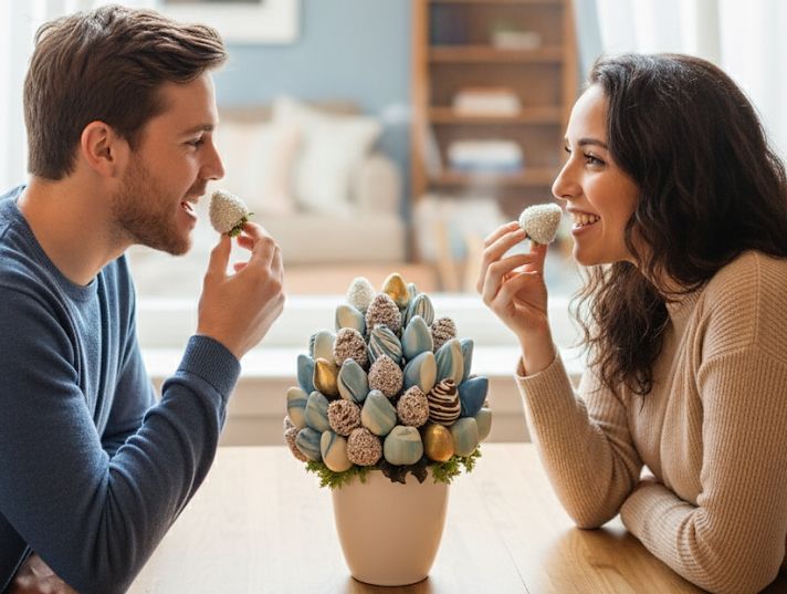 Představte si to překvapení, když pošlete své partnerce, blízkým či přátelům kytici… Kytici z jahod v čokoládě, s variací barev, posypků… vázanou nebo v květináči… Co třeba zlaté jahody? Jahody růžové, modré, bílé, sněhové nebo se zkusíme domluvit na úpravě dle Vašich představ? Kytice z jahod překvapí, potěší, je nádherná a přinese výjimečný chuťový zážitek.