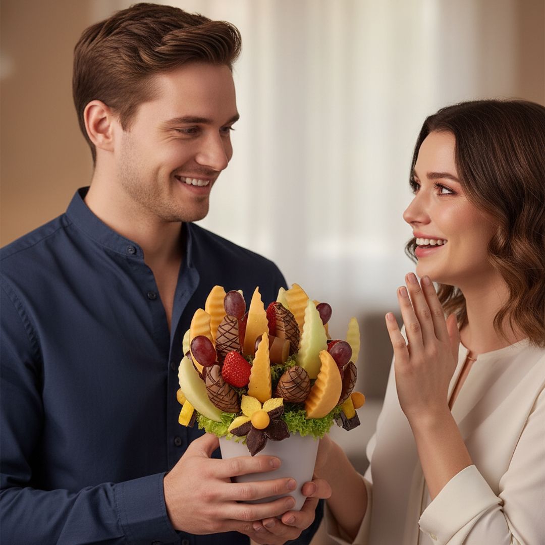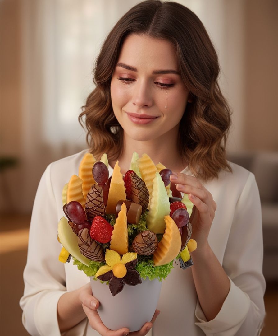Kytice "Ovocné pohlazení" je přesně to. Je to něžný dárek v naší nabídce – tichá, ale sladká kompozice, která se dotkne srdce a pohladí duši. Není to okázalá kytice, je to balzám na nervy, který chutná po čerstvém ovoci, čokoládě a lásce.