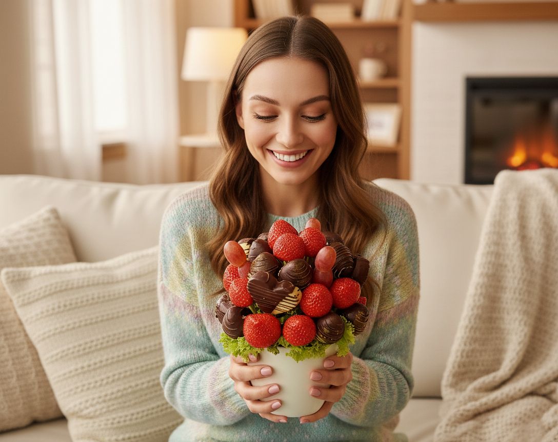 Kytice Čokoládové pokušení je tou správnou volbou pro milovníky sladkého potěšení. Dokonale vybrané jahody, ananas a hroznové víno, částečně obalené v tmavé čokoládě dodá každé příležitosti výjimečnou atmosféru. Skvělý dárek, který propojuje svěžest a sladkost, ideální pro vyjádření lásky pozornosti.