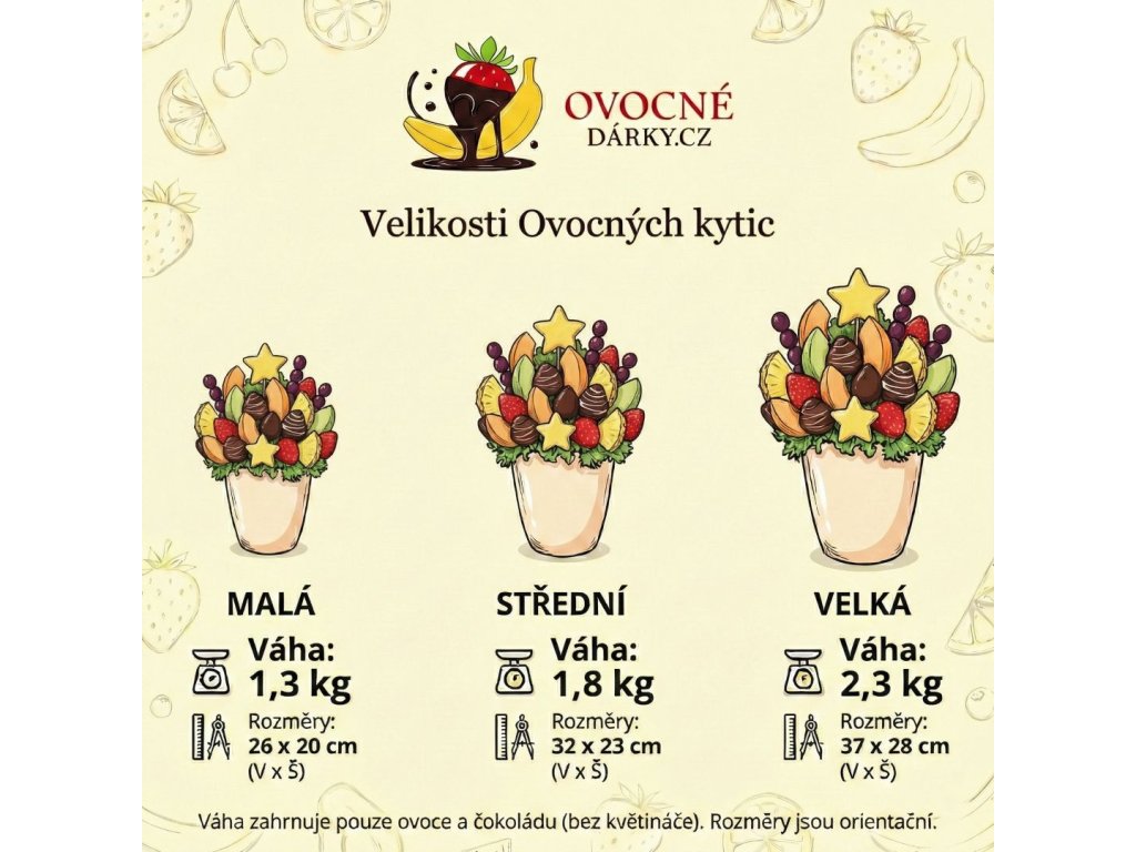 Ovocné dárky vyrábíme ručně s nadšením a náležitou péčí. Každý den vybíráme čerstvé, svěží a chutné ovoce. Z tohoto důvodu může být finální produkt lehce odlišný od fotografie.